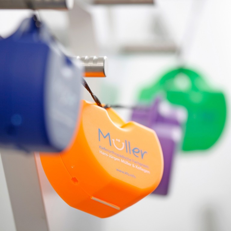 Die herausnehmbaren Behandlungsgeräte sind Zahnspangen, die es sowohl einzeln für einen Kiefer gibt als auch als zusammenhängende Kompaktgeräte für beide Kiefer. Die Farben für die Spange dürfen sich unsere Patienten selbst aussuchen und es gibt sogar kleine, bunte Bilder, die in die Klammer eingebracht werden und sich der Patient selbst aussuchen darf.